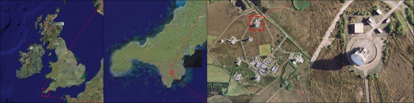 Next Image The Lizard Peninsula and the location of Goonhilly Earth Station (images from Google Earth, editing by me) The Lizard Peninsula and the location of Goonhilly Earth Station (images from Google Earth, editing by me)
