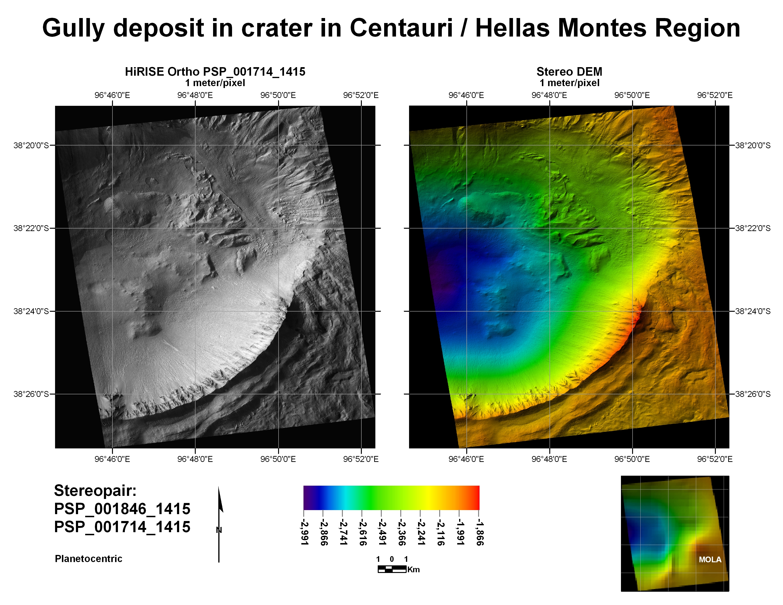 A DEM, if you don’t already know, is a digital elevation model. This is a product that can also be produced from a HiRISE stereo pair. HiRISE DEMs are awesome because they can model the terrain at a resolution of 1 meter per post! That means for every square meter of Mars visible in a HiRISE image (for which we have stereo) we can derive an elevation value. This provides the opportunities to measure geological features, model hydrology and spacecraft traverses.