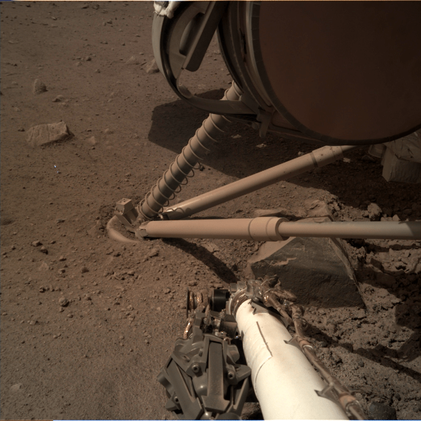 One of InSight’s three legs can be seen here slightly sunken into the Martian regolith, showing us how soft and powdery the uppermost layers of the mission’s landing zone is. Oh, and that rock to the right? Luckily InSight missed it [NASA/JPL-Caltech]
