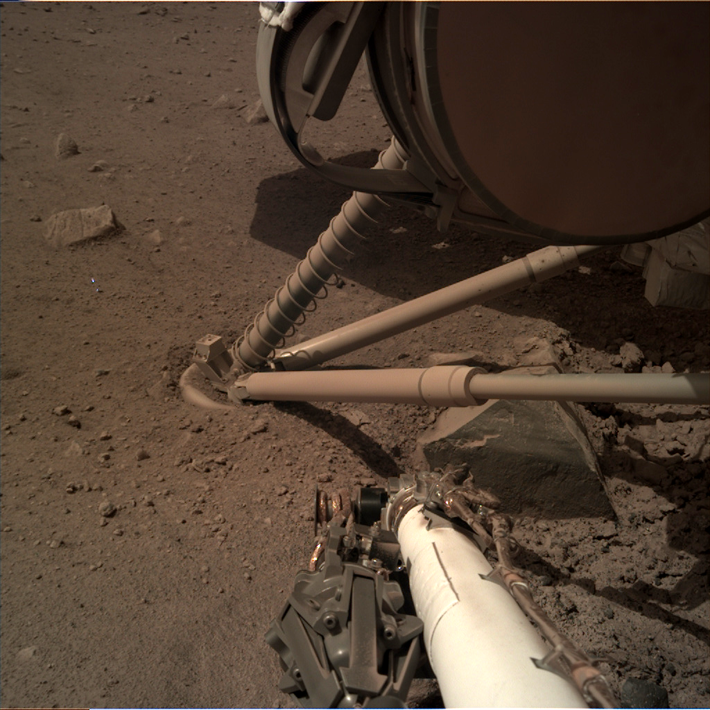 One of InSight’s three legs can be seen here slightly sunken into the Martian regolith, showing us how soft and powdery the uppermost layers of the mission’s landing zone is. Oh, and that rock to the right? Luckily InSight missed that when it landed [NASA/JPL-Caltech]