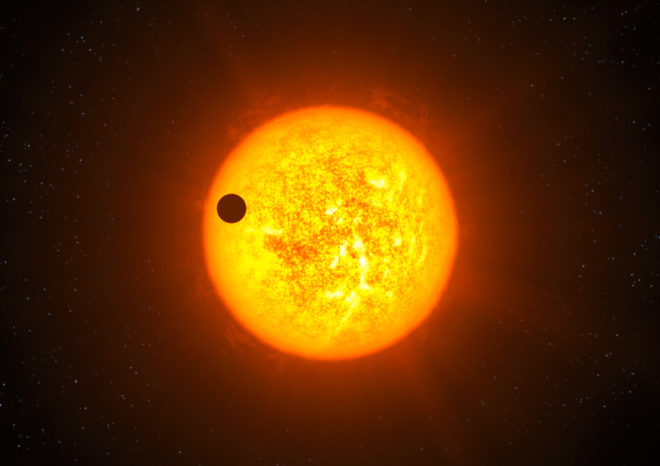 This artist’s impression shows the transiting exoplanet Corot-9b. Discovered by combining observations from the CoRoT satellite and the ESO HARPS instrument, Corot-9b is the first “normal” exoplanet that can be studied in great detail. This planet has the size of Jupiter and an orbit similar to that of Mercury. It orbits a star similar to the Sun located 1,500 light-years away from Earth towards the constellation of Serpens (the Snake). Corot-9b passes in front of its host star every 95 days, as seen from Earth. This “transit” lasts for about 8 hours. Like our own giant planets, Jupiter and Saturn, the planet is mostly made of hydrogen and helium, and it may contain up to 20 Earth masses of other elements, including water and rock at high temperatures and pressures.
