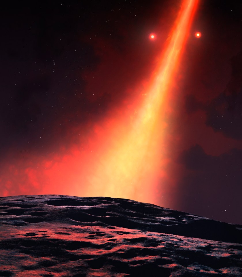 Artwork of the system HD 98000. This is a binary star comprising two sun-like components, surrounded by a thick disc of material. What’s different about this system is that the plane of the stars’ orbits is inclined at almost 90 degrees to the plane of the disc. The disc could be a remnant asteroid belt, or it could be forming new planets. Here is a view from the surface of an imagined planer orbiting in the inner edge of the disc.