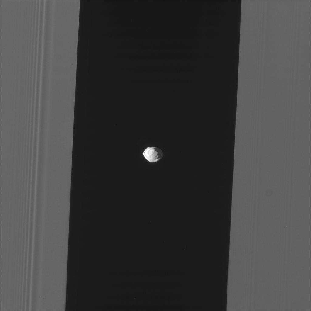 Resembling a giant ravioli or some kind of “flying saucer” from a classic alien invasion sci-fi comic, Pan is known as a “shepherd moon” occupying the so-called Encke Gap inside Saturn’s A Ring. This gap is largely free of particles and it has become Pan’s job to hoover up any stray material — the moon’s slight gravity pulls particles onto its surface and scatters others back out into the ring system. This gravitational disturbance creates waves that ripple through the ring material, propagating for hundreds of miles.