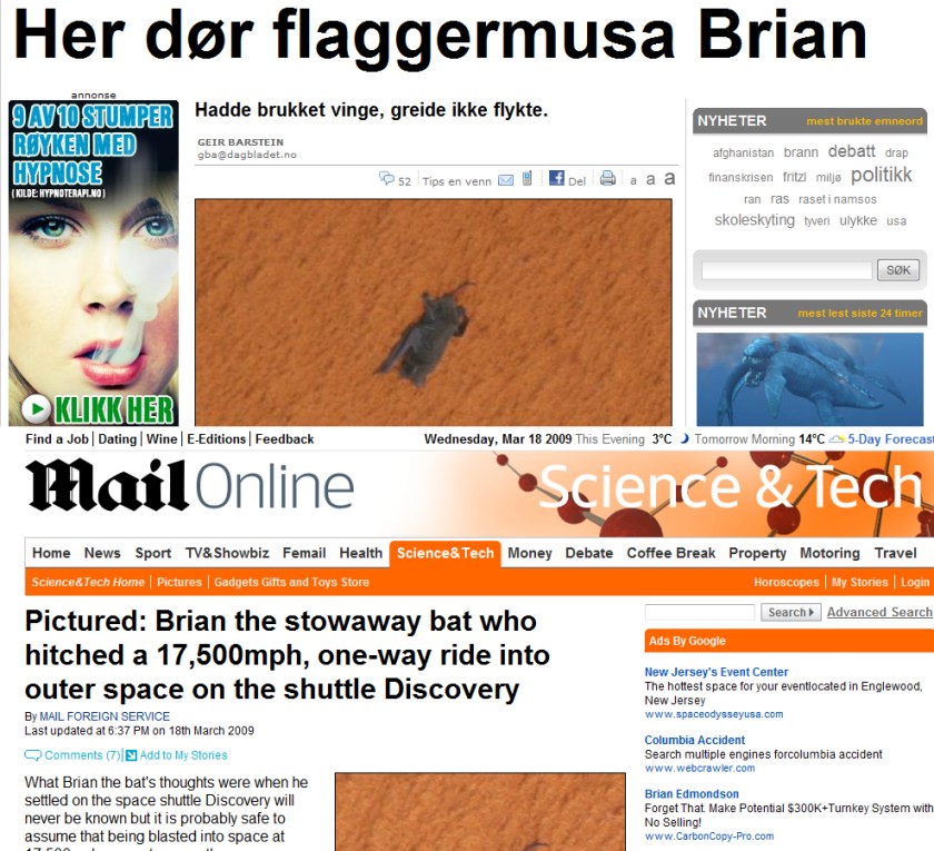 As a science communicator, I’m always on the lookout for interesting hooks to stories that wouldn’t otherwise be of interest, and on March 15, 2009, Brian was that hook — who knows what kind of impact that little free-tailed bat had on viewers who wouldn’t have otherwise been paying attention to one of the biggest endeavors in human exploration history.