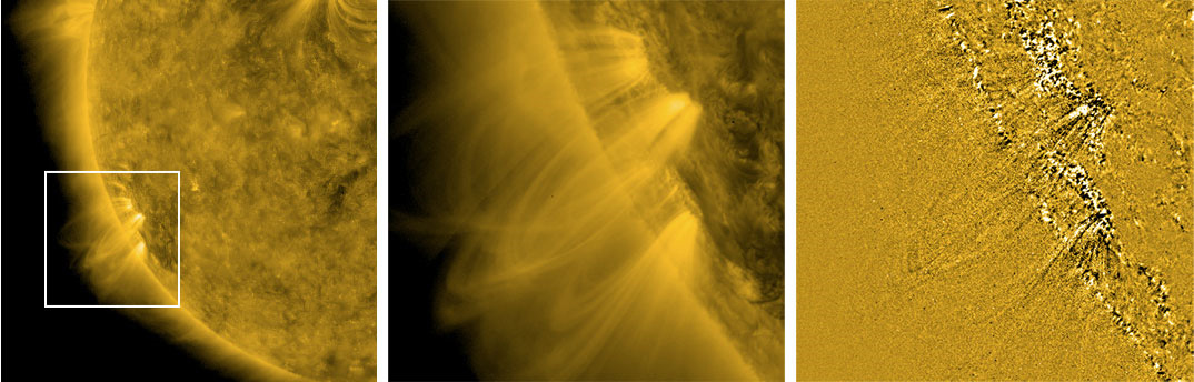 As our Sun is a massive blob of magnetized plasma, it doesn’t rotate uniformly (like the Earth does), it actually rotates a little faster at its equator than at its poles, a phenomenon known as “differential rotation.” Now, if you imagine the solar magnetic field as straight lines running from pole to pole, you can imagine that, over time, the field will start to wrap around the equator like an elastic band being stretched out of shape and wrapped around the middle. At its most extreme, so much rotational tension will be applied to the magnetic field that it becomes contorted. This contortion creates an upward pressure, forcing vast loops of magnetized plasma, known as coronal loops, to pop through the Sun’s photosphere — a.k.a. the solar “surface” — like annoyingly twisted loops of garden hosepipe (see the diagram above).